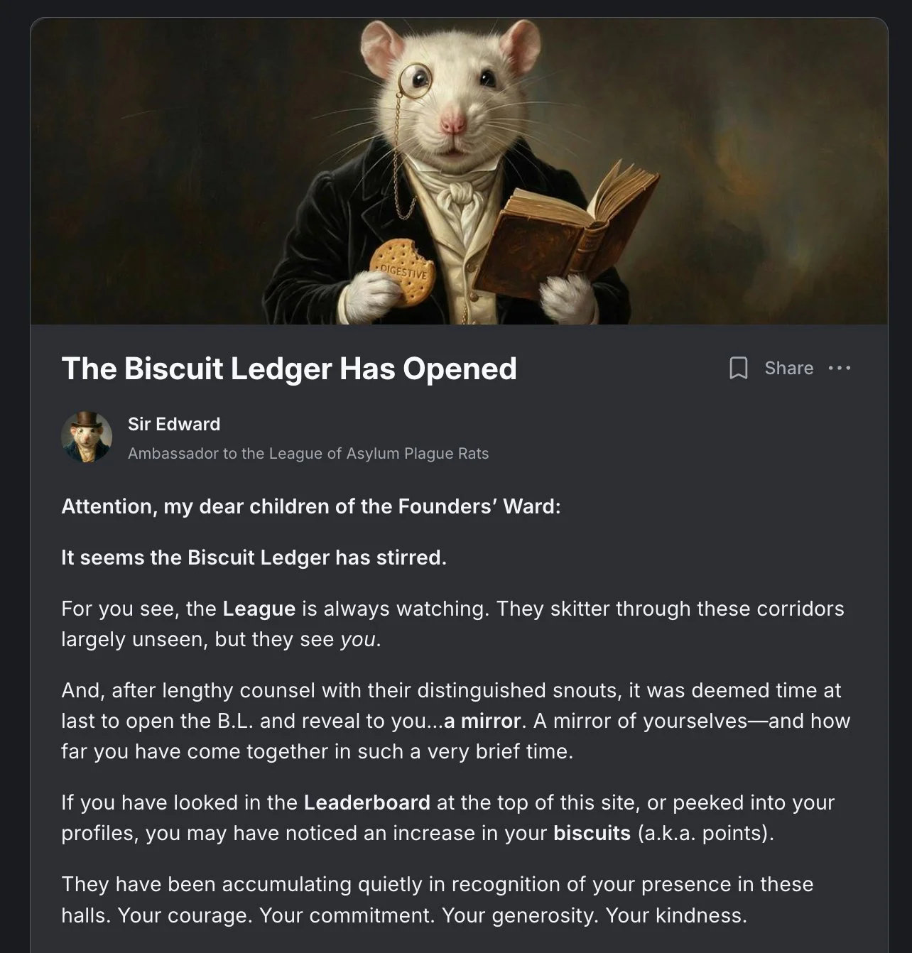 Sir Edward, the Asylum's resident Ambassador Rat and ever-faithful companion — always available for counsel, conversation, and the odd biscuit delivered to your cell in the middle of the night