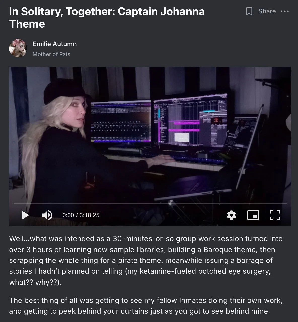 Twice each month, EA welcomes you into her private recording studio and creates new work live — composing and recording music ranging from new songs to film scores — while you work on your own projects alongside her.